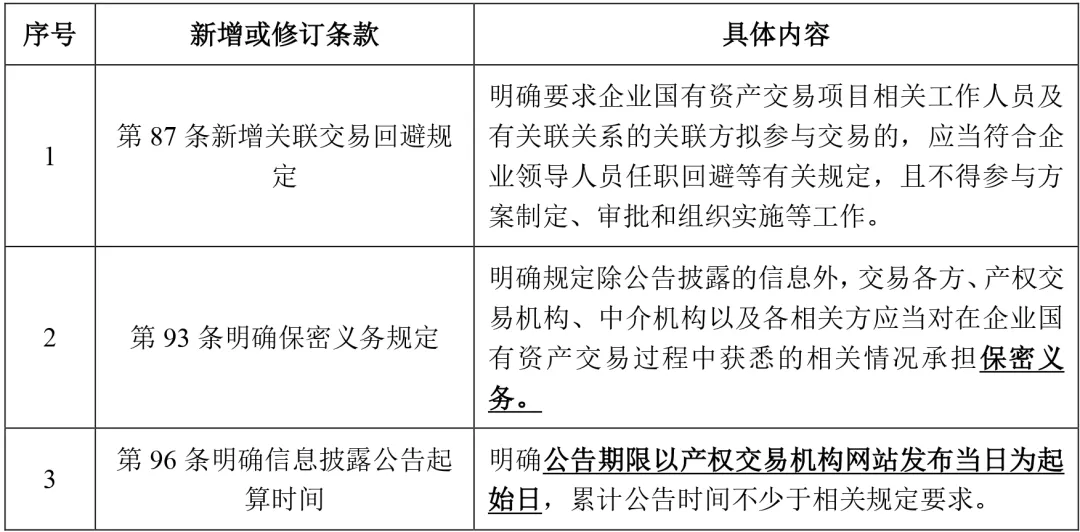根據(jù)17號(hào)文的相關(guān)內(nèi)容的新增、修訂,針對(duì)其中重點(diǎn)新增和變化的內(nèi)容,國(guó)有企業(yè)應(yīng)當(dāng)進(jìn)行重點(diǎn)關(guān)注,因其涉及到國(guó)有資產(chǎn)交易流程、方式等內(nèi)容的細(xì)化和革新,在實(shí)操中國(guó)有企業(yè)應(yīng)當(dāng)學(xué)習(xí)新變化的內(nèi)容并在實(shí)際工作中進(jìn)行調(diào)整,以免面臨合規(guī)風(fēng)險(xiǎn):