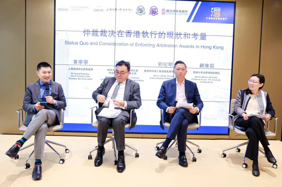 上海市律師協會副會長、國浩上海合伙人黃寧寧主持題為“仲裁裁決在香港執行的現狀和考量”的圓桌研討,并與香港大律師公會內地事務常委會聯席主席許偉強資深大律師,全國政協委員、香港億利達工業發展集團有限公司主席劉紀明和香港大學法律學院副教授顧維遐進行分享討論。