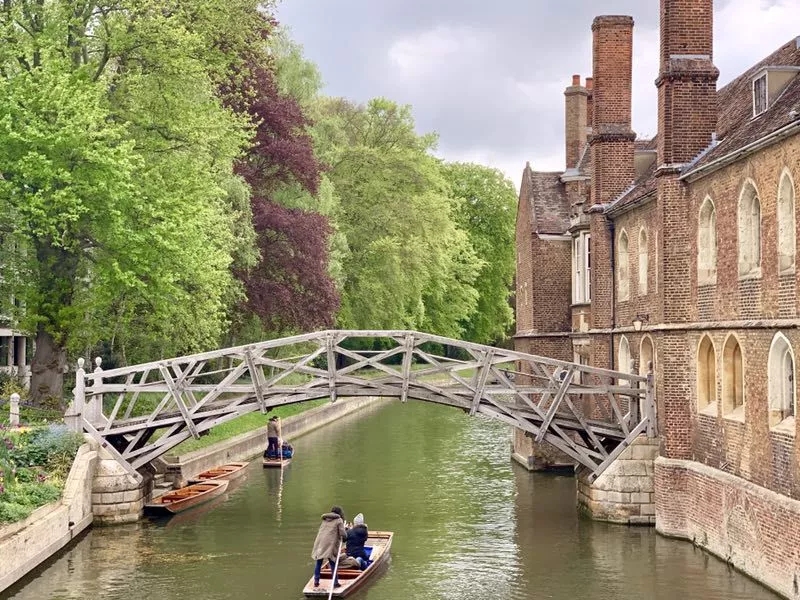泛舟在靜水流淌的劍河上,穿行在各大學院的古老建筑間,行走在散發花木氣息的草坪上,慢慢感受劍橋的美。迎面來到的是一座誤傳為牛頓所建造的數學橋。實際上,當初這木質的數學橋,在1749年由威廉?埃斯里奇設計、詹姆斯?埃塞克斯建造,陪伴著劍河沿岸最古老的建筑——紅磚壘砌的劍橋大學女王學院院長官邸,走過了250多個春秋。