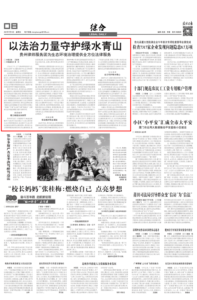 貴州省生態(tài)文明律師服務(wù)團(tuán)秘書(shū)長(zhǎng)、國(guó)浩律師(貴陽(yáng))事務(wù)所律師鄭世紅告訴記者說(shuō),貴州省發(fā)出“強(qiáng)省會(huì)”行動(dòng)令明確提出,努力把貴陽(yáng)貴安打造成為首位度更高的省會(huì)城市、生態(tài)性更強(qiáng)的功能城市、幸福感更足的宜業(yè)城市。生態(tài)文明律師服務(wù)團(tuán)成員立足貴州實(shí)際,用專業(yè)法律知識(shí)助力解決生態(tài)環(huán)保難題,努力結(jié)合貴陽(yáng)市市情以“黨建紅”引領(lǐng)“生態(tài)綠”實(shí)現(xiàn)“強(qiáng)省會(huì)”,為國(guó)家生態(tài)環(huán)境治理能力提升發(fā)揮作用。