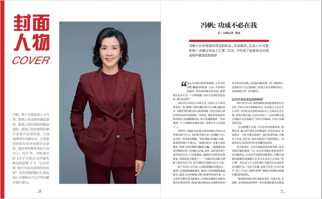 2021年,馮帆提交的《關于協助企業開展刑事合規管理 擴大“企業犯罪 相對不起訴適用機制改革”試點范圍的建議》被全國人大常委會辦公廳列為重點督辦建議。