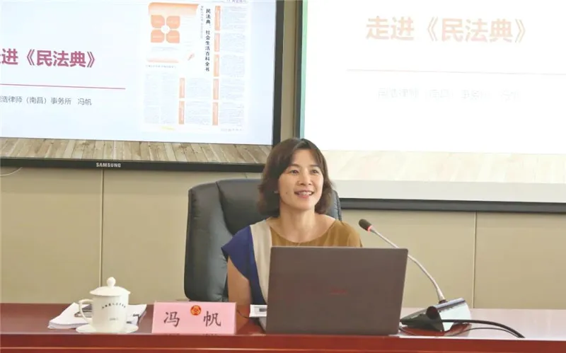 2020年全國兩會后,民法典正式通過,馮帆回到江西,成為了江西省民法典普法講師團成員之一,為機關、學校、醫院、銀行、企業、農村等開展了50場民法典宣講,還牽頭成立江西省女律師民法典宣講團,展現了巾幗力量。