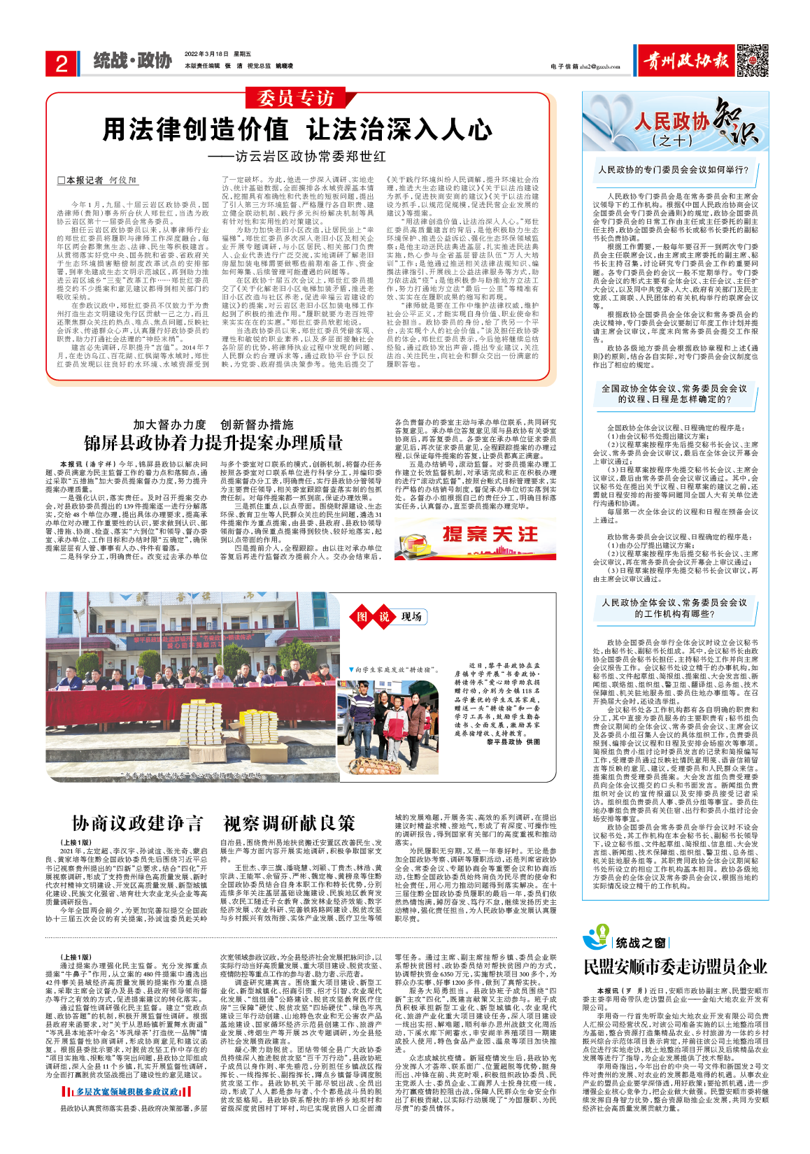 在參政議政中,鄭世紅委員不僅致力于為貴州打造生態(tài)文明建設(shè)先行區(qū)貢獻(xiàn)一己之力,而且還聚焦群眾關(guān)注的熱點(diǎn)、難點(diǎn)、焦點(diǎn)問題,反映社會(huì)訴求、傳遞群眾心聲,認(rèn)真履行好政協(xié)委員的職責(zé),助力打通社會(huì)法理的“神經(jīng)末梢”。