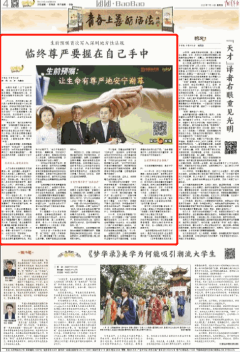 6月23日,深圳市第七屆人民代表大會常務(wù)委員會第十次會議表決通過《深圳經(jīng)濟(jì)特區(qū)醫(yī)療條例》修訂稿,在全國首次將患者“臨終決定權(quán)”——生前預(yù)囑寫入地方性法規(guī),該法規(guī)將于2023年1月1日正式施行。此舉引發(fā)社會各界熱議。