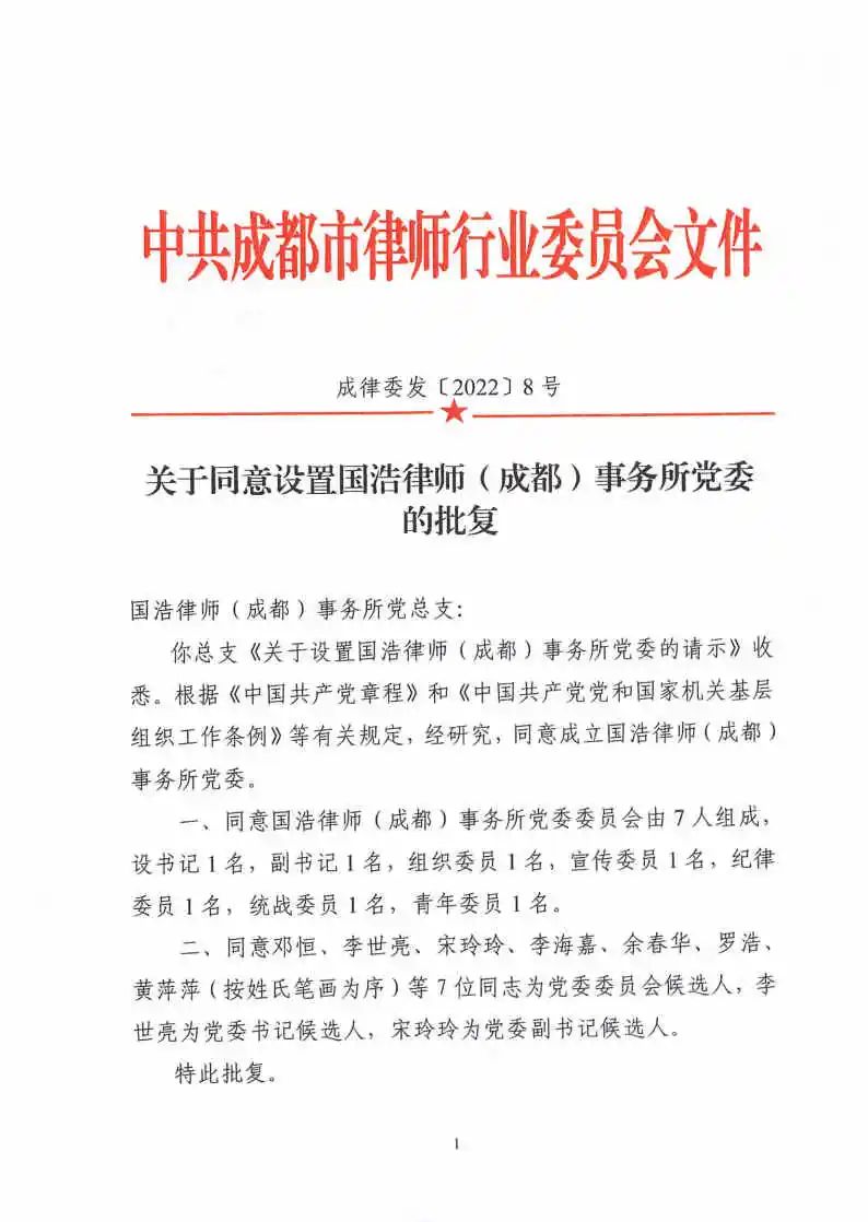 2022年4月,國浩律師(成都)事務所黨委經成都市律師協會黨委批準成立,既是落實律師行業黨建規范化建設工作要求的“響舉”,也是著眼律師事務所長遠發展的“務實之策”。?