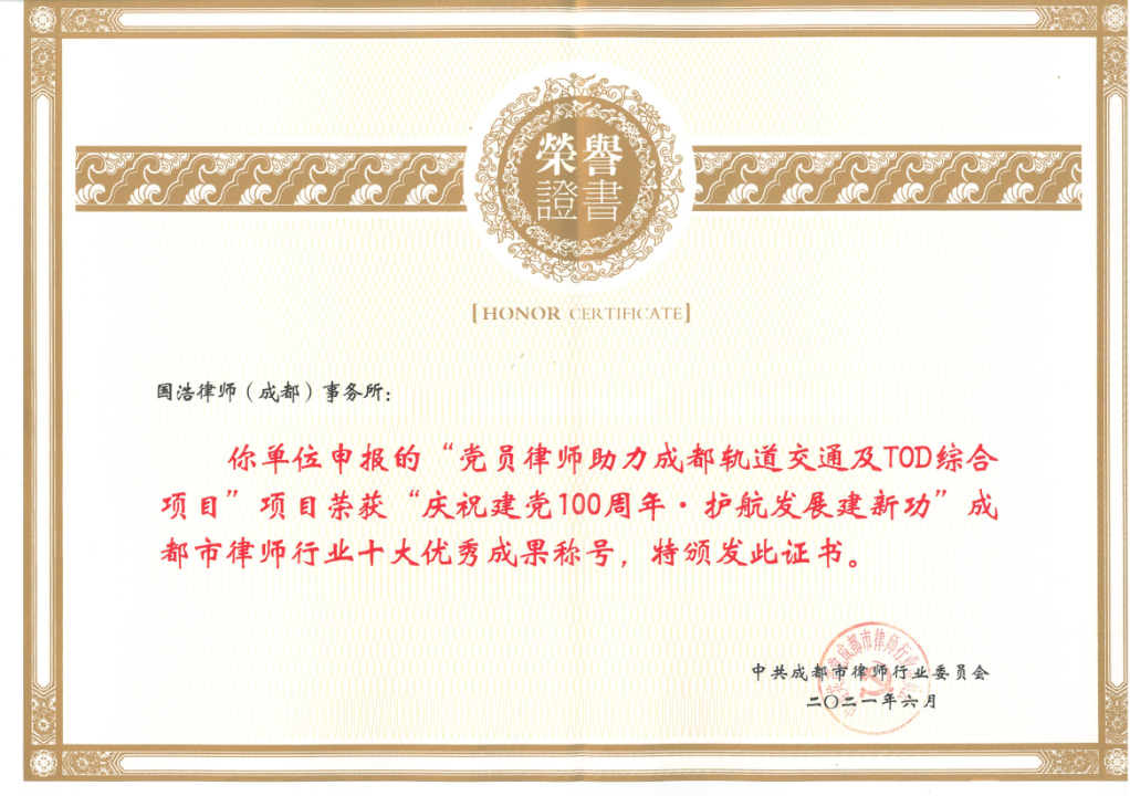 國浩成都為軌道交通及TOD綜合開發項目提供了全過程的優質法律服務,從而為成都建設TOD示范城市貢獻了重要力量。國浩成都的努力也獲得了市司法局、市律協肯定,榮獲“慶祝建黨100周年?護航發展建新功”十大優秀成果。?