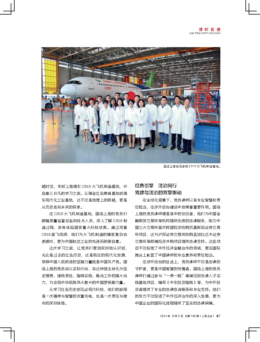 這種信念如同種子,在國浩上海的黨員心中生根發(fā)芽。他們帶著信念,跨越時空,來到上海浦東C919大飛機制造基地,開啟意義非凡的學習之旅。從瑞金紅色教育基地到浦東現(xiàn)代化工業(yè)基地,這不僅是地理上的跨越,更是從歷史走向未來的探索。