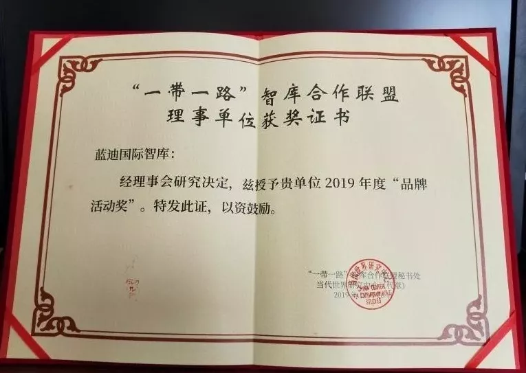 藍迪國際智庫榮獲2019年度“一帶一路”智庫合作聯(lián)盟“優(yōu)秀理事單位品牌活動獎”