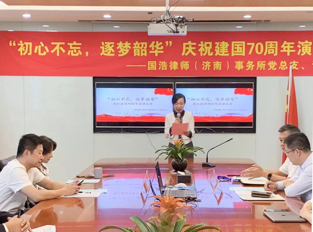 9月23日,國浩濟南黨總支和青年委員會組織了“初心不忘,逐夢韶華”慶祝建國70周年、律師制度恢復重建40周年專題演講比賽。15位國浩濟南青年律師為祖國70華誕獻上最深情的贊歌和祝福,并抒發了自己對律師事業的熱愛和砥礪奮斗的決心。本次比賽由國浩濟南管理合伙人、主任、黨總支書記鄭繼法,合伙人孫守遐、劉建鑫、李源擔任評委。鄭繼法律師在開幕致辭中指出了本次演講比賽的重要意義,同時對青年律師的發展提出了更高的要求。