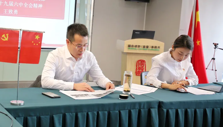 12月2日,在國浩重慶合伙人、黨支部書記王致勇的主持下,國浩重慶黨支部召開專題會議,號召國浩重慶全體黨員、入黨積極分子學習貫徹黨的十九屆六中全會精神,以期從會議中汲取優秀經驗、獲得力量。