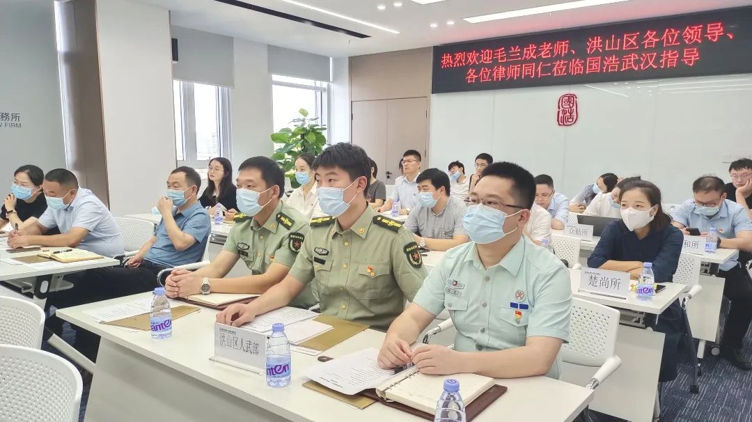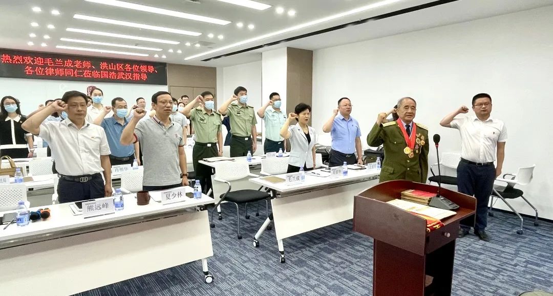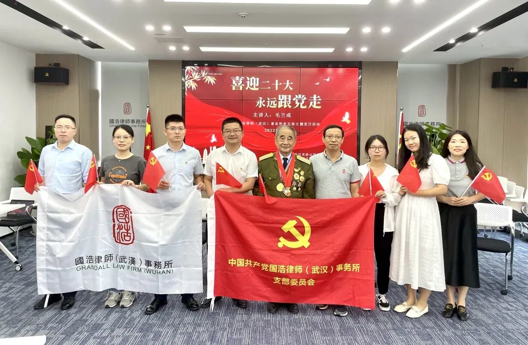 7月1日上午,在武漢市洪山區司法局、武漢市律師行業黨委的指導下,國浩武漢黨支部與湖北首義律師事務所黨支部結對共建,特邀請原武漢軍區空軍政治部宣傳部長(大校軍銜)、空軍老戰士報告團團長毛蘭成老師蒞臨國浩武漢開展“喜迎二十大,永遠跟黨走”主題宣講活動。洪山區司法局、洪山區人民武裝部、湖北共合律師事務所等單位領導和律師同仁蒞臨國浩武漢參加活動。國浩武漢管理合伙人、主任夏少林,管理合伙人王亞軍,黨支部副書記、律師胡斌,黨員律師胡超等熱情接待。
