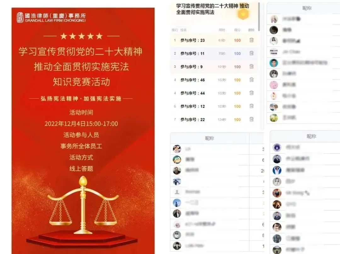 12月4日,國浩重慶黨總支和國浩重慶辦公室管委會聯合舉辦了“學習宣傳貫徹黨的二十大精神,推動全面貫徹實施憲法”線上知識競賽活動。本次知識競賽以習近平總書記在中國共產黨第二十次全國代表大會上所作的報告和《中華人民共和國憲法》為內容,100余名國浩重慶員工參與了答題。